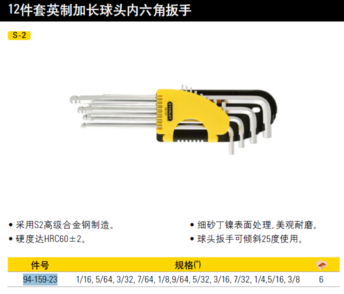 史丹利(STANLEY)12件套英制加长球头内六角扳手 94-159-23