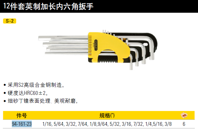 史丹利(Stanley)订制12件套英制内六角扳手 12件套英制加长内六角扳手 94-161-23